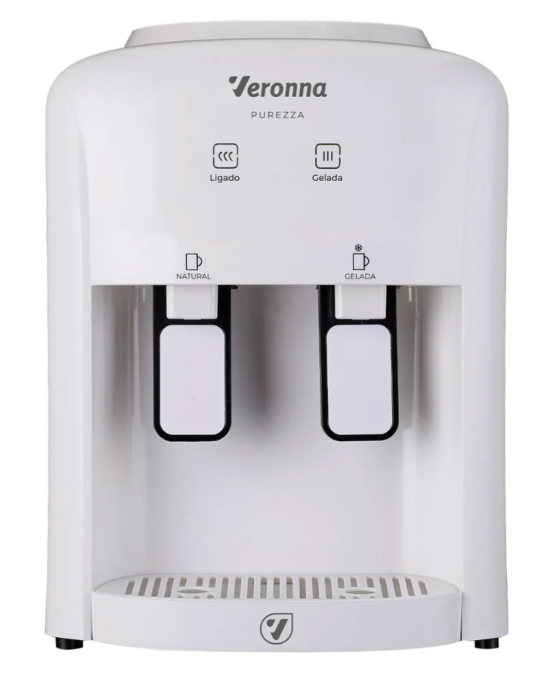 BEBEDOURO DE MESA REFRIGERADOR ELÉTRICO BIVOLT – Veronna DESCRIÇÃO: Bebedouro Veronna BE200 é ideal para manter sua hidratação diária com água na temperatura que desejar. Compatível com galões de 10 e 20L, oferece duas opções de temperatura: natural ou gelada. Conta com um sistema perfurador que facilita a troca do galão sem necessidade de retirar o lacre, evitando derramamentos. A bandeja coletora removível contribui para uma limpeza fácil e mantém o ambiente organizado. VANTAGENS: – Seu design compacto se integra à decoração da cozinha. O bebedouro possui baixo consumo de energia e duas torneiras super-resistentes, uma para cada temperatura de água. A passagem direta do galão para a torneira evita contato externo, e o dreno permite a remoção de água acumulada. CARACTERÍSTICAS: – Grau de proteção: IPXO (para uso interno); – Tipo de Instalação POU: (PONTO DE USO); – Temperatura máxima: 32°; – Temperatura mínima: 10°; – Vida útil: 5.000 litros. ESPECIFICAÇÕES: – Bivolt automático: 127V – 220V / 60Hz / 65W; – Ciclo de Retirada de Água – 1,166/ h; – Volume de Descarte médio – 0,05 l; – Volume de Água Gelada – 0,240 l; – Tempo de inicialização – 90min. OBSERVAÇÕES: – Pastilha de peltier, um cooler termoelétrico onde, quando alimentado com a energia, consegue aquecer ou resfriar a água; – Ideal para até duas pessoas, com um reservatório de 600ML; – A capacidade de resfriamento é de até 0,6 litros por vez. Modelo: BE200